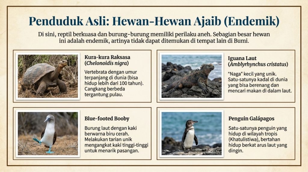 Kepulauan ini punya kura-kura raksasa (Chelonoidis nigra) yang beratnya luar biasa dan bisa hidup sampai lebih dari 100 tahun. Nama “Galápagos” sendiri sebenarnya diambil dari kata dalam bahasa Spanyol lama yang berarti “kura-kura”. Di sana, Darwin menyadari kalau kura-kura dari pulau yang berbeda punya bentuk cangkang yang berbeda juga, tergantung lingkungan tempat mereka tinggal. Jadi, Galápagos itu benar-benar tempat di mana sejarah ilmu pengetahuan dunia dibuat!