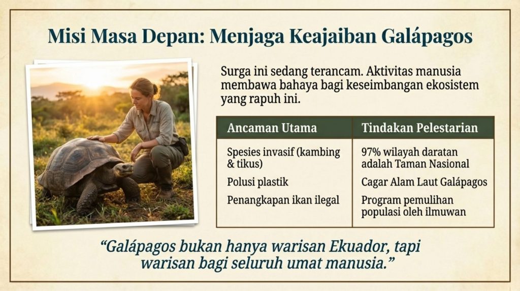 Mungkin kalian mikir, “Terus hubungannya sama kita sebagai siswa apa?” Nah, Galápagos sekarang sedang menghadapi ancaman besar, mulai dari sampah plastik, penangkapan ikan ilegal, sampai spesies pendatang yang merusak ekosistem asli.