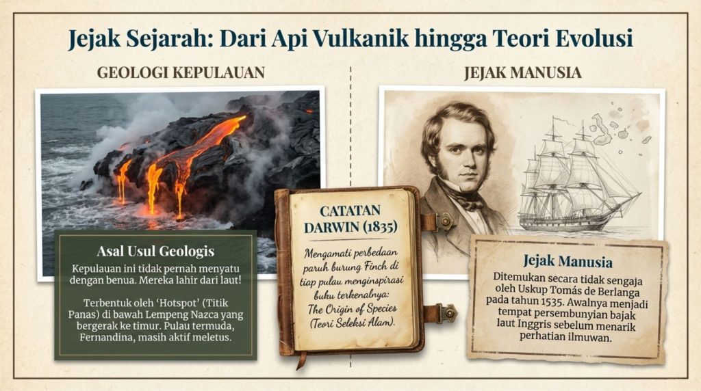 Tahu nggak, guys, seorang ilmuwan terkenal bernama Charles Darwin pernah mendarat di sini pada tahun 1835 menggunakan kapal HMS Beagle. Meskipun dia cuma tinggal selama lima minggu, apa yang dia lihat di Galápagos—seperti burung finch dan kura-kura raksasa—menginspirasi lahirnya Teori Evolusi yang kita pelajari di buku teks sekarang.