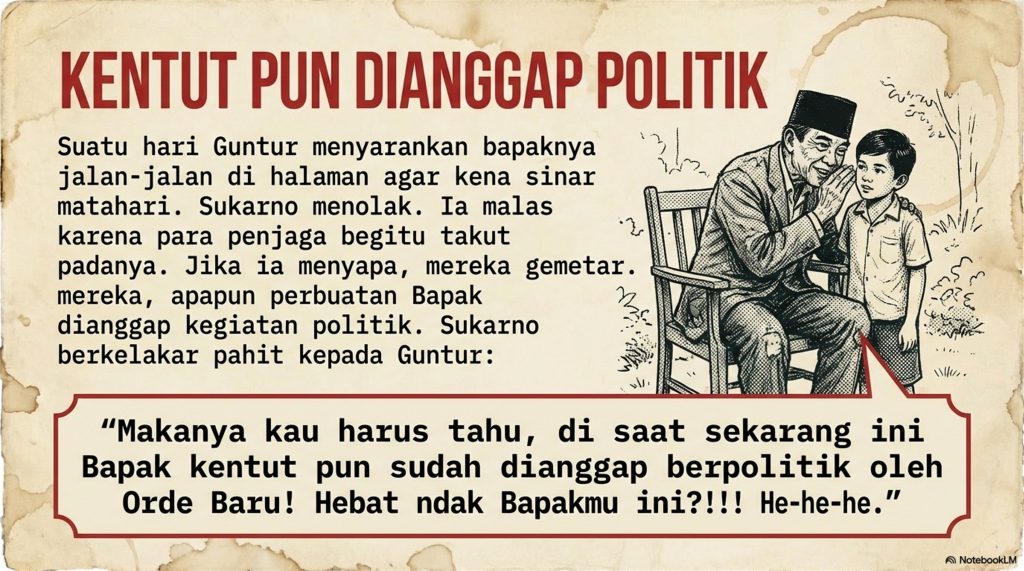 Guntur nyaranin ayahnya buat jalan-jalan di halaman biar sehat. Tapi Bung Karno malah bercanda, “Bapak malas, Tur. Di sini Bapak ngapa-ngapain aja dicurigai. Bahkan kalau Bapak kentut pun, orang-orang Orde Baru bakal mikir itu strategi politik!” Meskipun lagi sakit dan susah, selera humor Bung Karno tetap juara.
