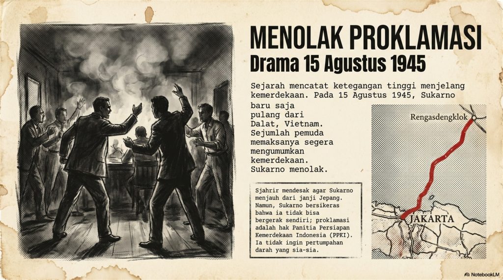 Puncaknya, ada tokoh pemuda bernama Wikana yang mengancam bakal ada pertumpahan darah kalau proklamasi ditunda. Bung Karno yang emosian tapi keren langsung bilang, “Ini leher saya! Seret saya ke pojok sana dan habisi sekarang juga, jangan nunggu besok!” Garang banget, kan? Akhirnya, setelah sempat “diculik” ke Rengasdengklok, beliau baru mau proklamasi di rumah Laksamana Maeda.