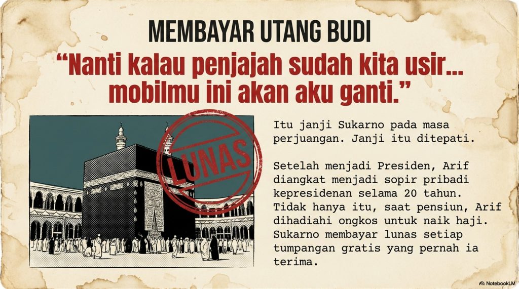 Bung Karno janji bakal ganti mobil Pak Arif kalau penjajah sudah pergi. Janji itu ditepati! Setelah jadi Presiden, Pak Arif diangkat jadi sopir pribadi Bung Karno selama 20 tahun. Pas pensiun, Pak Arif bahkan dihadiahi berangkat naik Haji. Definisi teman sejati, ya!