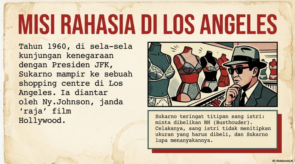 Tahun 1960, Bung Karno main ke Los Angeles, AS. Nah, beliau ingat kalau istrinya titip dibelikan pakaian dalam (bra). Masalahnya: Bung Karno lupa ukuran istrinya!