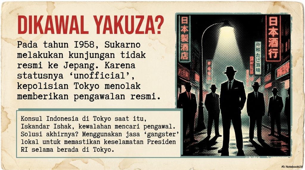 Singkat cerita, teman Bung Karno menghubungi pimpinan Yakuza (gengster terkenal di Jepang) namanya Yoshio Kodama. Akhirnya, Bung Karno dikawal sama 20 anggota Yakuza selama 8 hari di sana. Hasilnya? Aman sentosa dan beliau pun senang karena diajak jalan-jalan terus.