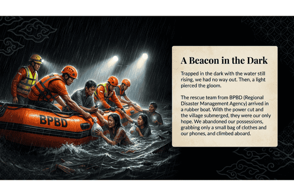 Two weeks ago, a big flood hit Demak, Central Java. It happened after very heavy rain for three days. The water from the river rose quickly because a levee (tanggul) broke. My family and I were at home when the water started to enter our village on Thursday night.