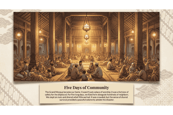 Next, a rescue team from BPBD came with a rubber boat. They helped us to evacuate because the electricity was turned off and it was very dark. We brought only a small bag of clothes and our cellphones. We went to the grand mosque near our village that served as a shelter. We stayed there for five days with hundreds of other people.